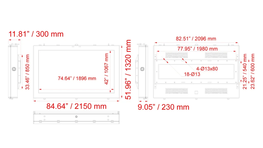 | Dimension (W x H) | 84.64 x 51.96 x 11.81” / 2150 x 1320 x 300 mm |