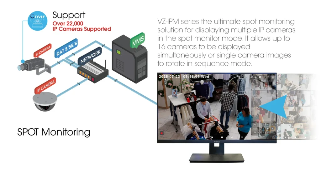 The ViewZ IP Monitor with onboard Android OS connects to VMS/NVR or IP cameras for streaming live video. Eliminate the need for a client PC with a simple all-in-one solution. Install the android app of your choice and you’re good to go !