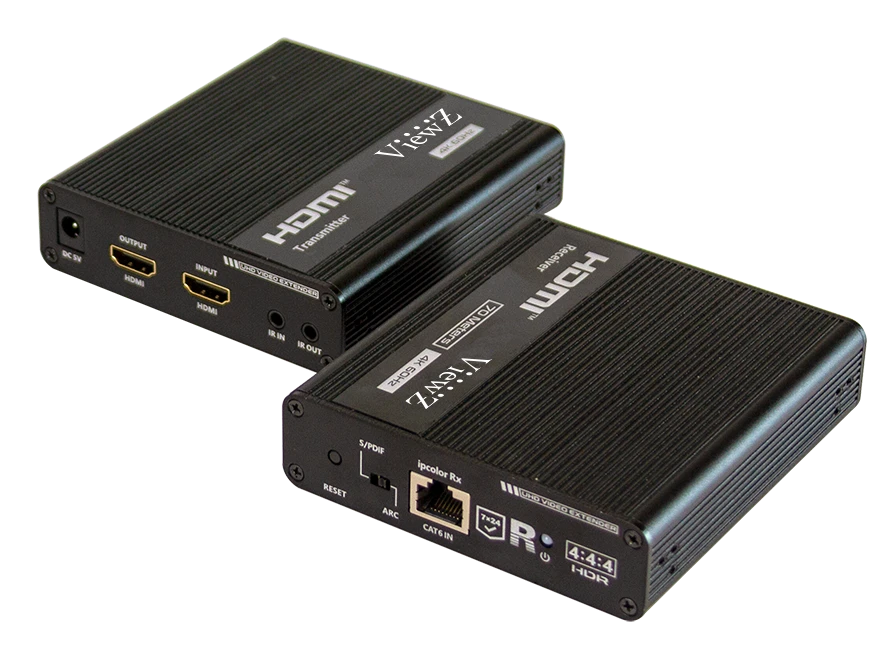 VZ-1TRX-4K extender includes a transmitter unit and a receiver unit, allows HDMI signal to be transmitted up to 230 ft (70 m) at 4K resolution by using a CAT 6/6A/7 cable. It is perfect for videowall or security monitor installation. VZ-1TRX-4K extender uses new technology, ipcolor that stands for global leading UHD video digital transmission, the core of ipcolor is supporting zero latency, 4K resolution uncompressed transmission through 10G Ethernet by using Ethernet cables.