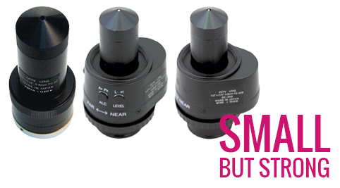 ViewZ pinhole lenses used for applications where the camera and lens must be hidden. The front of lens has a small opening to allow the lens to view an entire room through a small hole in a wall or other flat surface. They are available in 1/2" and 1/3” formats with manual or DC auto-iris.
