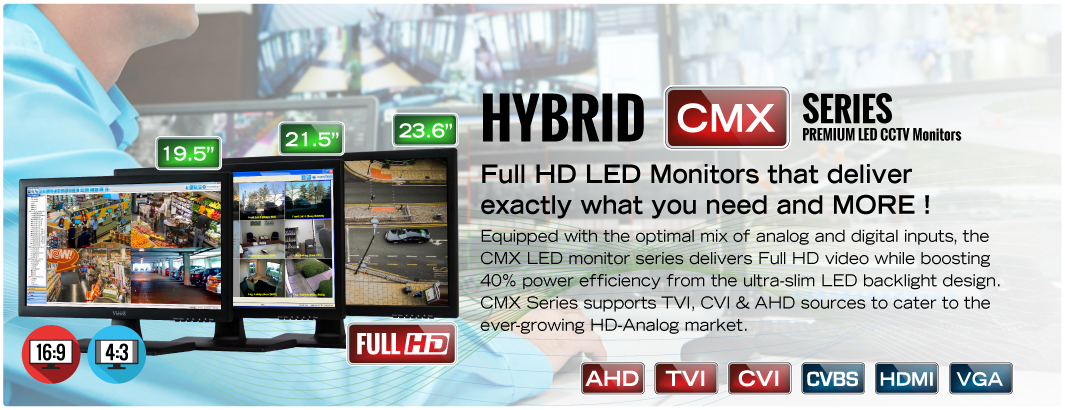 * CMX series Input- HDMI, VGA, PC/AV Audio In, 1 AV (CVBS) In/Out, 1 Hybrid AV(AHD,TVI,CVI) In/Out.