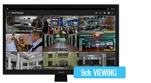 VZ-IPM series supports 9ch viewing mode with each camera stream at 640 x 360 resolution. This function is applicable with over 10,000 camera models that support single or muti streaming.