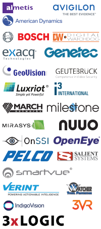 3xLogic | Aimetis | Alnet | Arteco | Avigilon | Axis | Axxonext | Clickit | Dahua | Digital Watchdog | Digifort | Exacq | Genetec | Hikvision | i3international | Indigio Vision | ITX security | Luxiriot | March Network | Milestone | Mirasys | Nuuo | OnSSI | OpenEye | Panasonic | Pelco | Salient Systems | SeeTec | Synology | Verint | Watcher Total Protection