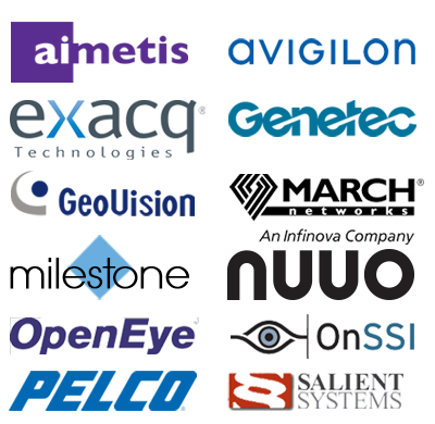 Aimetis | Alnet | Arteco | Avigilon | Axis | Axxonext | Dahua | Digital Watchdog | Digifort | Exacq | Genetec | Geutebruck | Hikvision | ITX security | March Network | Milestone | Mirasys | Nuuo | OnSSI | OpenEye | Pelco | Salient Systems | SeeTec | Synology | Verint | 3xLogic