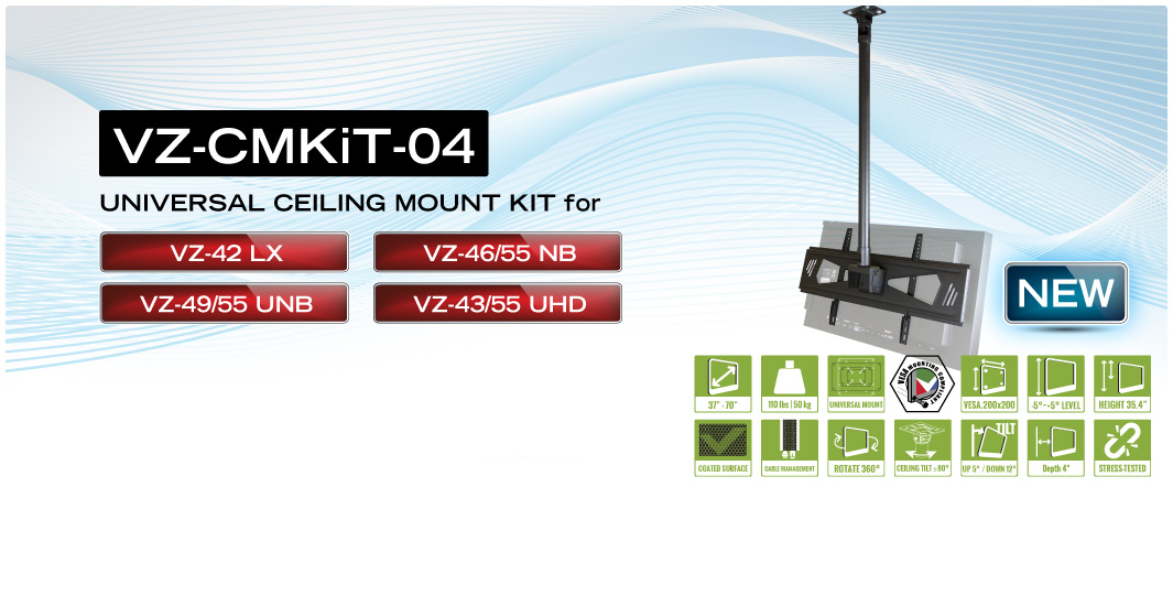 Ceiling Mount Kit: Kit-01 (Ceiling Mount + VESA Mounting Plate) , KiT-02 (Ceiling Mount + Pole + VESA Mounting Plate), KiT-04 (Ceiling Mount + Pole + Universal Mounting Plate) |