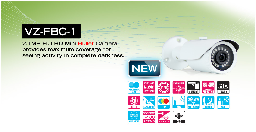 VZ-FBC-1 (HD Bullet Fixed Lens camera) are small yet feature- rich. Combination of HD resolution and features like day/night and true WDR results in great performance at a great price.