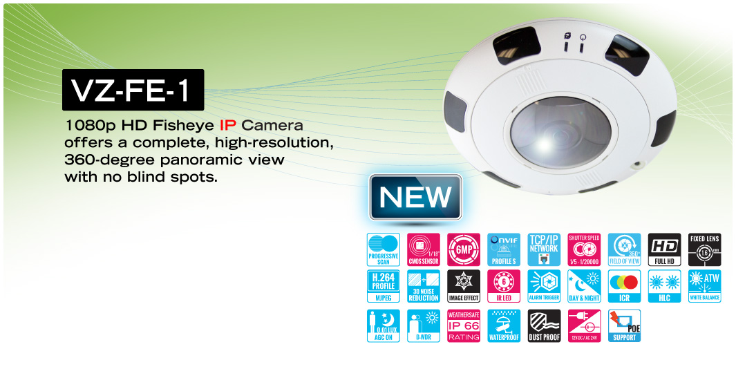 The new VZ-FE-1 Fisheye camera model offers a complete, high-resolution, 360-degree panoramic view with no blind spots. Cost effective and easy to install, VZ-FE-1 is a 6-megapixel camera that’s designed to provide broad coverage with fewer cameras.